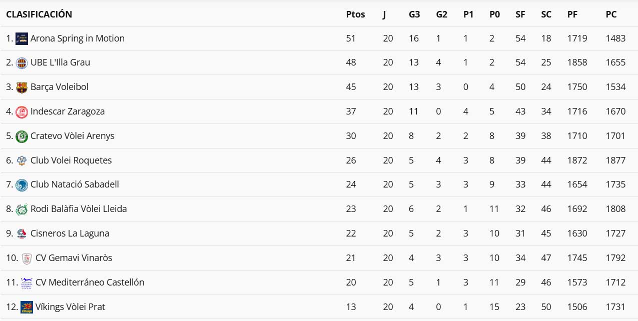 Podeu veure la classificació de la Superlliga 2 Masculina al seu grup B, després de la  vintena jornada del campionat de lliga: