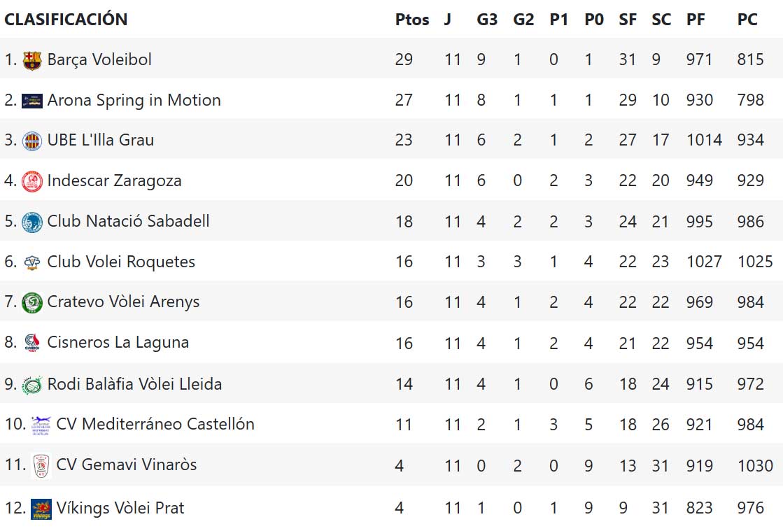 Podeu veure la classificació provisional de la Superlliga 2 Masculina al seu grup B, després de l’onzena jornada del campionat de lliga, la podeu veure a continuació: