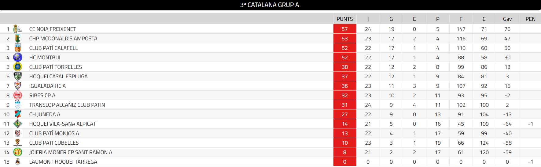 Podeu veure la taula classificatòria de la 3a Catalana Masculina (grup A) després de disputar-se la vint-i-tresena jornada de lliga a la imatge següent: