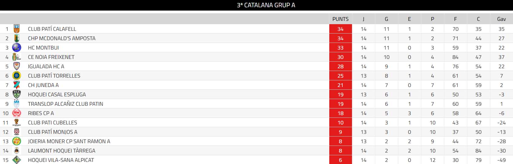 Podeu veure la taula classificatòria de la 3a Catalana Masculina (grup A) després de disputar-se la quinzena jornada de lliga a la imatge següent: