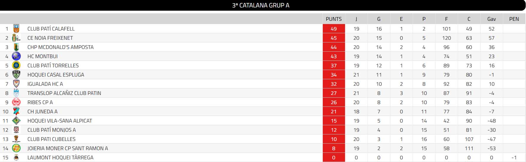Podeu veure la taula classificatòria de la 3a Catalana Masculina (grup A) després de disputar-se la vint-i-dosena jornada de lliga a la imatge següent: