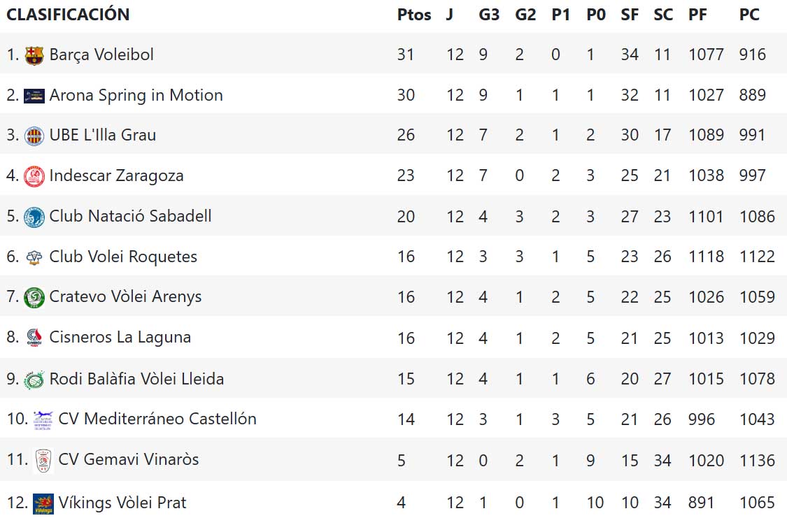 Podeu veure la classificació provisional de la Superlliga 2 Masculina al seu grup B, després de la dotzena jornada del campionat de lliga, la podeu veure a continuació:
