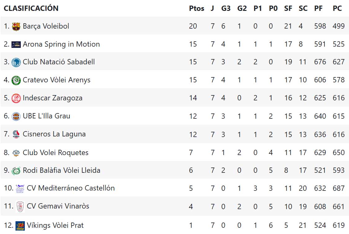 Podeu veure la classificació provisional de la Superlliga 2 Masculina al seu grup B, després de la setena jornada del campionat de lliga, la podeu veure a continuació: