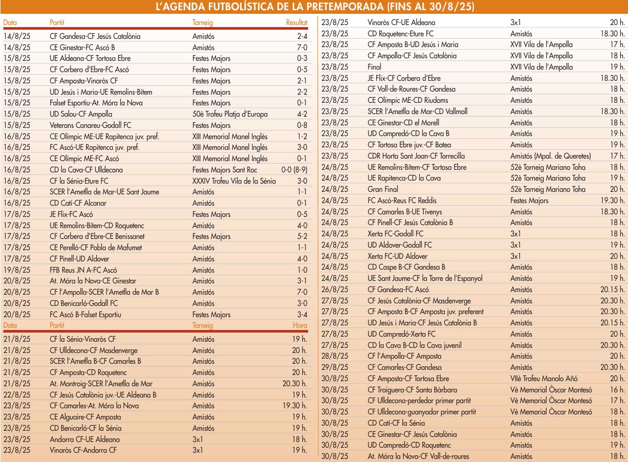 L’actualització i el seguiment detallat de l’agenda futbolística de la pretemporada es podrà seguir com és habitual durant el període estival al diari digital www.ebresports.cat. L’agenda preveu la data del partit, els dos equips protagonistes, el nom del torneig o el motiu en què s’emmarca el partit, i un cop disputat també apareixerà el resultat de l’encontre.