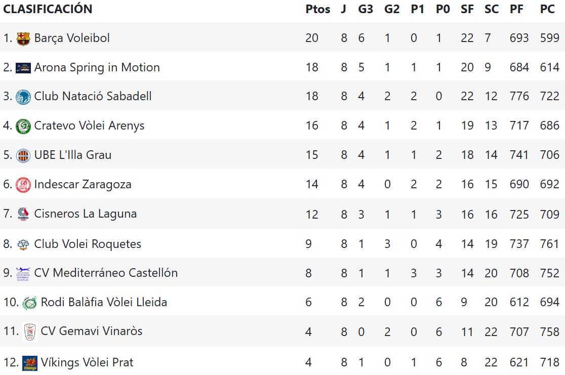 Podeu veure la classificació provisional de la Superlliga 2 Masculina al seu grup B, després de la vuitena jornada del campionat de lliga, la podeu veure a continuació: