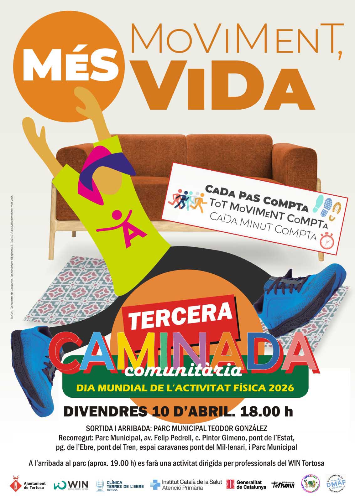En el cas de Tortosa, l’activitat principal serà la tercera edició de la Caminada Comunitària, oberta a tota la ciutadania, que tindrà lloc el proper divendres, 10 d’abril, a partir de les 18.00 hores. El lloc de sortida i arribada serà el parc municipal Teodor González, amb un itinerari per les dos vores del riu Ebre, que recorrerà l’avinguda de Felip Pedrell, el carrer del Pintor Gimeno, el pont de l’Estat, el passeig de l’Ebre, el pont Roig, l’avinguda de Lleida, el passeig de Ribera i l’àrea d’autocaravanes del pont del Mil·lenari. En arribar de nou al parc, cap a les 19.00 hores, es farà una activitat dirigida per professionals del WIN Tortosa.