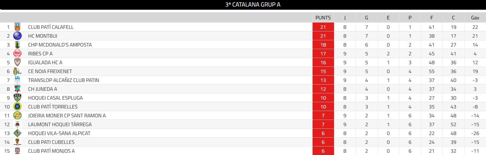 Podeu veure la taula classificatòria de la 3a Catalana Masculina (grup A) després de disputar-se la novena jornada de lliga a la imatge següent: