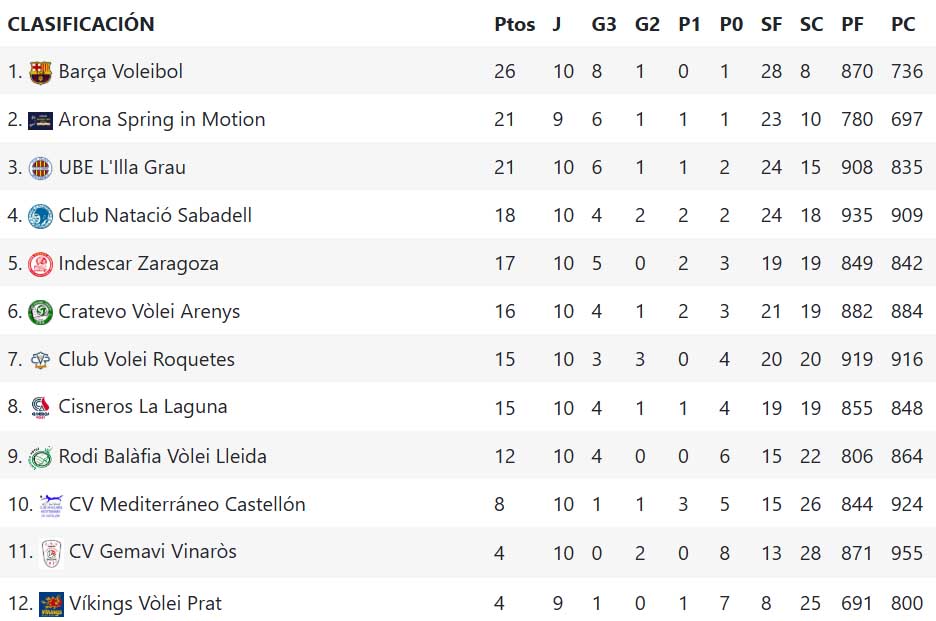 Podeu veure la classificació provisional de la Superlliga 2 Masculina al seu grup B, després de la desena jornada del campionat de lliga, la podeu veure a continuació: